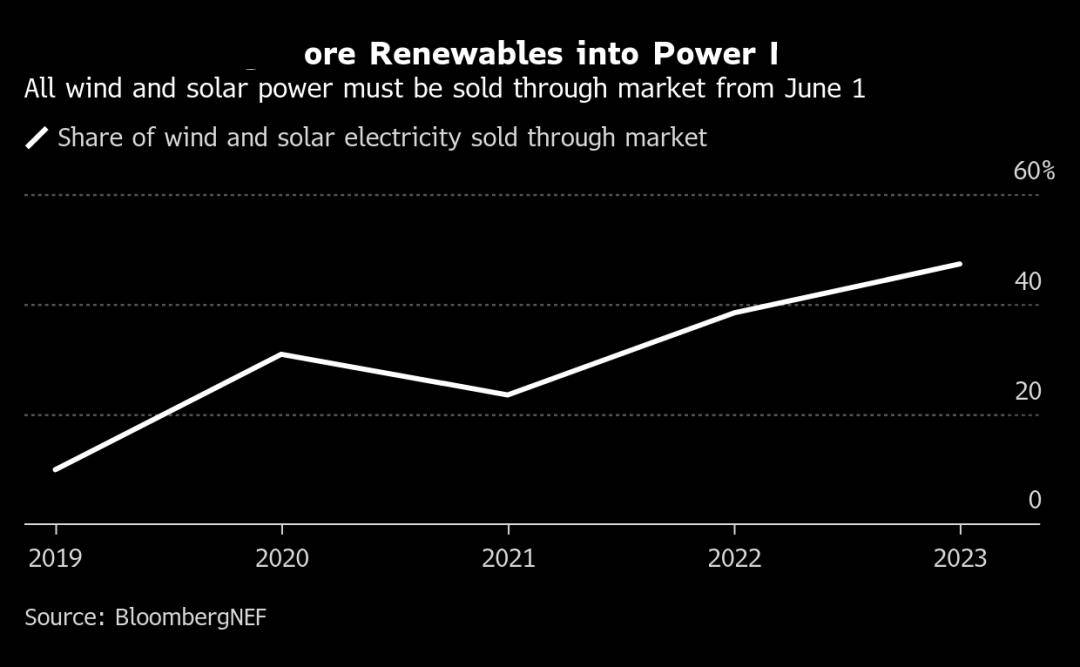 2023年中国近一半的风能和太阳能发电是在公开市场上销售的,而2019年这一比例还不到10%。其余部分则按照与煤炭基准价格挂钩的固定价格出售,煤炭是中国的主要电力来源。为全面落实新规,中国政府正在加速推进原本计划在本世纪20年代末完成的改革。